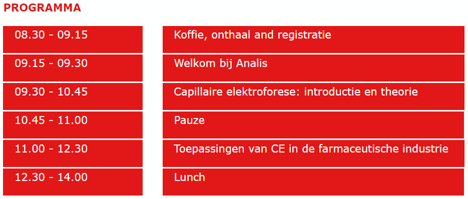 Tijdens deze sessie krijgt u een theoretische inleiding in capillaire elektroforese. Daar CE vooral in de farmaceutische industrie gebruikt wordt, belichten we vnl. de applicaties binnen dit vakdomein.