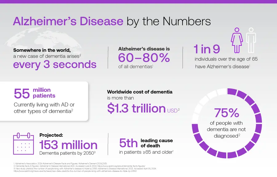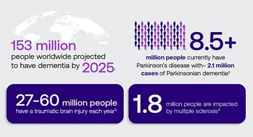 - 8.5+ million people currently have Parkinson’s disease with ~2.1 million cases of Parkinsonian dementia2